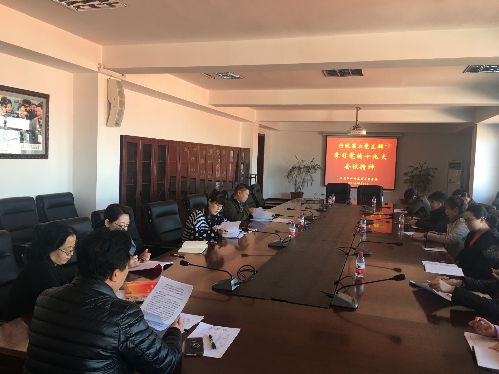 2017年10月30日行政第二党支部在南岗校区1号楼十楼会议室召开支部大会,学习了党的十九大精神,会议由支部书记王凤新主持。