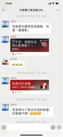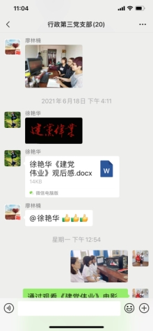 行政第三党支部按照党史学习教育工作部署,组织开展“党旗在基层一线高高飘扬”活动,采取“重温经典观看红色电影”为主题,进行红色教育。2021年6月18日到23日,行政第三党支部组织党员同志通过网络收看红色电影《建党伟业》,全体党员及积极分子怀着无比激动的心情,积极参加活动,并撰写观后感在党支部群中分享心得体会。范慧民老师特意录制了两首红色歌曲,为党的生日献礼。看了这部电影,同志们追忆那段历史,缅怀远去的革命先辈,深深感受到沉重的历史使命感和责任感。全体党员纷纷表示要不忘初心,牢记使命,承担起新时代赋予我们的重任,推动中华民族的伟大复兴,将祖国建设成为更加繁荣昌盛的社会主义现代化强国。