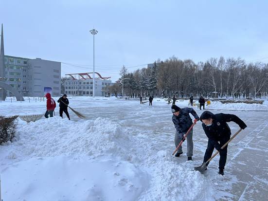 为了不让师生滑倒受到伤害,为了减轻物业人员的清雪工作压力, 11月23日清晨,天刚蒙蒙亮,日夜坚守在阿城校区工作岗位上的后勤第一党支部、护理系党支部、药学系党支部的党员干部,在支部书记的带领下,不分男女老少,抡起各种清雪工具齐上阵,不畏严寒,干劲十足,热火朝天。汗水湿透了衣衫,他们全然不顾,冰雪打湿了鞋袜,他们依旧坚持,刺骨的寒风吹红了脸、冻僵了手,他们已然不知......