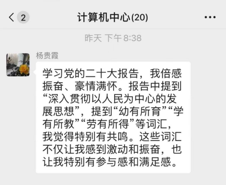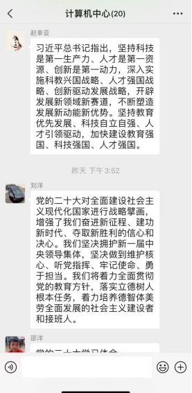 计算机中心组织部门教工20人进行党的二十大精神线上学习活动,并纷纷在群内讨论心得,大家感悟深刻,习近平总书记在党的二十大报告中,指明了中国共产党新征程的路线方针政策。在教学科研工作中,要学先学深,深入领会党的二十大报告的精神实质。结合部门工作和专业特点,让党的二十大精神进思想进课堂。
