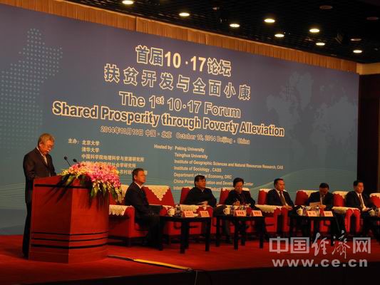 国务院扶贫办主任刘永富、国家发展改革委副秘书长范恒山、教育部副部长鲁昕、财政部党组成员、部长助理余蔚平、交通部副部长翁孟勇、水利部副部长矫勇、卫生计生委副主任王培安、人民银行行长助理郭庆平、国务院发展研究中心副主任韩俊、中华全国妇女联合会书记处书记、党组成员谭琳、中国科学院院士陆大道、清华大学教授胡鞍钢等分别在上午的主论坛上发表了演讲。联合国驻华协调员诺德厚先生宣读联合国秘书长潘基文的贺信。潘基文在贺信中充分肯定了中国扶贫开发的伟大成就,对中国政府设立扶贫日给予了高度赞赏,期待与中国合作共同应对全球发展挑战、帮助其他发展中国家加快消除贫困进程。