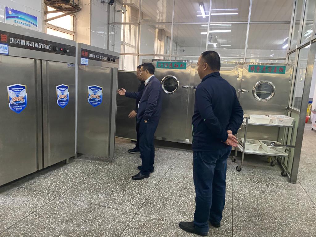 于新宇一行实地了解了学校食堂食品加工间、餐具洗消间、食品留样间等场所相关情况。实地查看餐厨操作间、主副食库房、面点间、留样柜、就餐区、售卖间等区域。