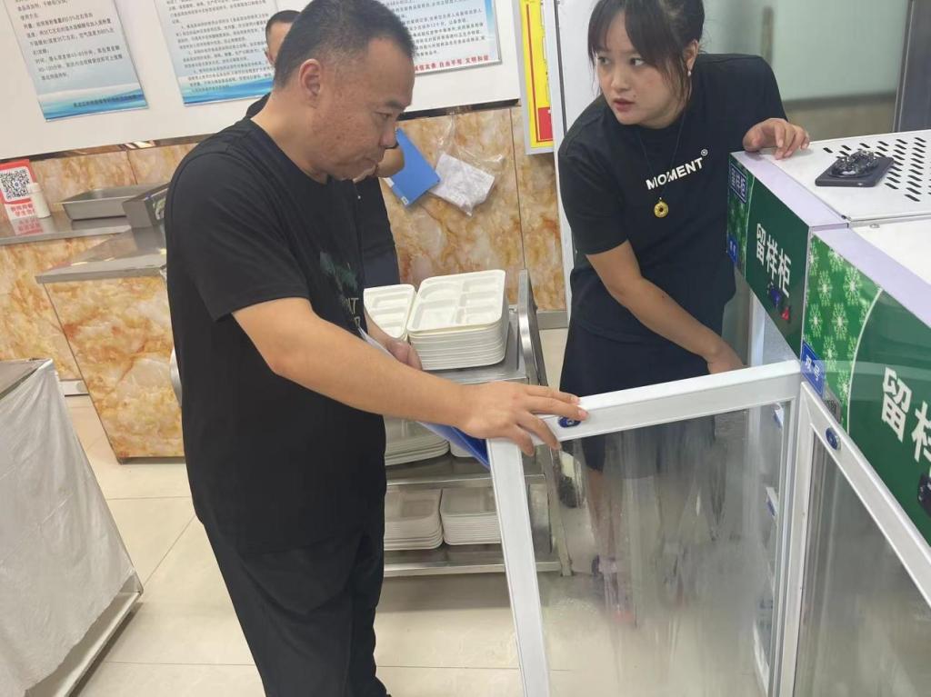 在相关负责人员的陪同下详细了解了各校区迎新准备情况、校园各项设施安全情况、食堂学生用餐情况、食品留样情况、各档口与后厨消防器材储备情况、食材进货与台账管理情况、各档口与后厨卫生情况。