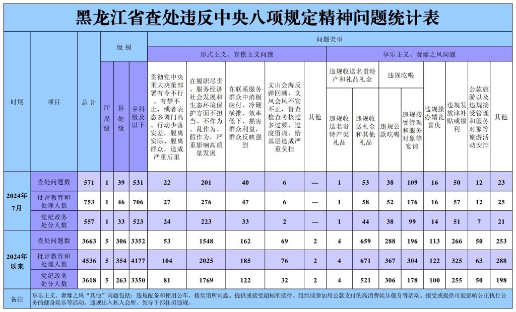 2024年7月,黑龙江省纪检监察机关共查处违反中央八项规定精神问题571起,批评教育和处理753人,其中党纪政务处分557人。