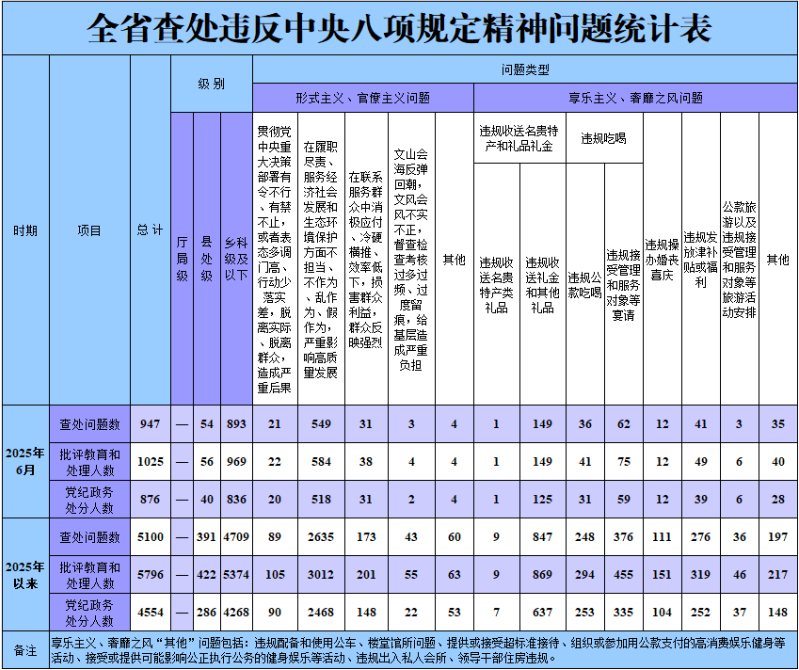 2025年6月,黑龙江省纪检监察机关共查处违反中央八项规定精神问题947起,批评教育和处理1025人,其中党纪政务处分876人。